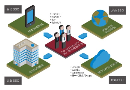 AccessMatrix™ 联邦 SSO ——作为一个联邦认证网关或代理,允许内部用户登录现有企业目录账户,然后无缝地登录到云应用(如 Salesforce.com、WebEx、Google Apps),实现跨域认证。