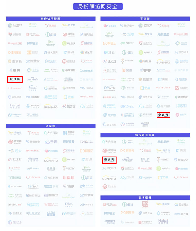 本次图谱调研成功收录312家网络安全企业,共分为六大类别和102个细分领域。北京安讯奔科技有限责任公司(安讯奔)成功登榜,分别入选了第一大类“基础技术与通用能力”的“身份和访问安全”的三个细分领域:身份访问管理、特权账号管理和零信任,以及第六大类“终端安全”的“端点防护”的一个细分领域:端点防护。